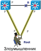 Тот, кто способен подключиться к устройству с (более) низким идентификатором моста — неважно, каким способом он это делает: путем подключения устройства с низким приоритетом или при помощи инструмента для генерации пакетов STP, — при определенных обстоятельствах может частично или целиком перевести на себя трафик всей виртуальной сети. Если через небольшие промежутки времени он будет менять приоритет, устанавливая его выше или ниже, то вследствие постоянного вычисления дерева связность снова нарушится, что будет равносильно атаке на «отказ в обслуживании» (Denial of Service, DoS).