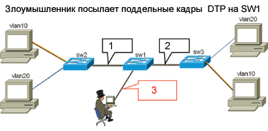 Злоумышленник, способный генерировать пакеты VTP с более высоким номером версии (путем подключения к сети устройства с высоким номером версии или отправки соответствующего сетевого пакета; условием для этого, однако, является наличие магистрального соединения с устройством, выполняющим роль «сервера VTP»), в состоянии полностью удалить информацию о виртуальных сетях всего домена VTP или всей сети.