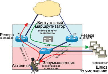 Протокол маршрутизаторов «горячего» резерва (Hot Standby Router Protocol, HSRP, RFC 2281) разработан компанией Cisco и предусматривает избыточную эксплуатацию нескольких маршрутизаторов, которые доступны под одним виртуальным IP-адресом и МАС-адресом. Такие маршрутизаторы периодически обмениваются приветственными сообщениями, отправляемыми на групповой адрес всех маршрутизаторов в данной подсети (224.0.0.2). На основании самого высокого передаваемого приоритета определяется, какой маршрутизатор становится «активным», т. е. действительно принимает трафик и направляет его дальше. Остальные находятся в неактивном резервном режиме. Если нарушитель обладает возможностью рассылать пакеты HSRP с большим приоритетом, чем у имеющегося участника HSRP, он может перевести все системы HSRP в резервный режим и таким образом либо осуществляет атаку DoS, и тогда трафик блокируется, либо направляет на свою систему весь проходящий через сегмент трафик (см. Рисунок 3).