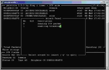 Проблема сама по себе не нова. Но поскольку Cisco никогда не публиковала спецификацию DTP, подобная атака долгое время считалась возможной лишь теоретически и только с использованием составляемых вручную пакетов ([1] также описывает этот метод). При помощи нового инструмента Yersinia (см. Рисунок 5) атакой можно легко управлять посредством меню.