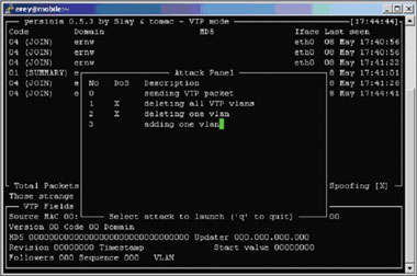 Это равносильно атаке DoS. Поскольку в случае VTP речь идет о пакетах второго уровня (как и у CDP, но со SNAP HDLC 0х2003), злоумышленник должен иметь контроль над системой с физическим доступом к одному из сегментов. Решающим является связь с портом устройства и — как описано выше — возможность построения («фальшивого») магистрального соединения. Атака тоже считалась осуществимой лишь теоретически из-за условия подключения к магистрали; и в этом случае Yersinia представляет собой «подходящий инструмент» для автоматического осуществления агрессии (см. Рисунок 8).