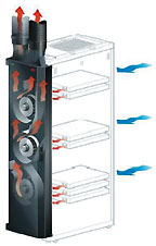 В случае повышенной плотности оборудования заднюю дверцу шкафа можно снять и заменить ее устройством для втягивания воздуха в шкаф в горизонтальной плоскости, например блоком откачки (ARU). Воздух втягивается в шкаф из «холодного» прохода с помощью вентиляторов, которыми оснащено установленное в стойку компьютерное оборудование. Вентиляторы, расположенные перед задней дверцей, отбирают горячий воздух, он выводится в помещение (а если используется ARU, то направляется назад) и подается на рециркуляцию системой кондиционирования, установленной в зале. При использовании таких аппаратов можно устанавливать оборудование с потребляемой мощностью 6-8 кВт, при этом следует применять запирающие панели (см. Рисунок 11).