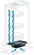 Устройства с лотками для вентиляторов, например блок распределения воздуха (ADU), устанавливаются в нижний отсек шкафа, они направляют воздушный поток вертикально, чтобы создать «завесу» из холодного воздуха между передней дверцей и серверами. Для обеспечения целостности системы вентиляции следует использовать запирающие панели (см. раздел «Панели-заглушки и упорядочивание кабелей»). Воздух проходит сквозь серверы и выводится в «горячий» проход. После охлаждения он подается на рециркуляцию системой кондиционирования, установленной в зале (см. Рисунок 10).
