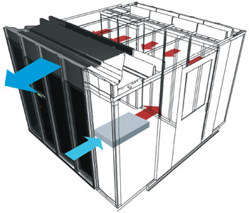 Встроенные системы охлаждения стоек оснащены всей инфраструктурой с устройствами распределения силовых кабелей, прерывателями, возможностью прокладки кабелей для передачи данных поверху, ИБП и подходящими решениями для охлаждения. Горячий воздух из серверов выводится в «горячий» проход и пропускается через охлаждающий блок, обеспечивающий его вывод обратно в помещение при температуре 240C. Таким образом, тепловая нагрузка уменьшается, и никакого влияния на температуру в помещении не оказывается (см. Рисунок 12).