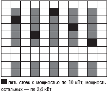 С учетом ширины проходов, блоков КВКЗ и т. д., а также при условии, что стойки занимают четверть общей площади пола, средняя удельная мощность составит 2800 Вт. При высоте фальшпола, равной 762 мм с учетом наличия проложенных внутри черного пола кабелей (силовых, для передачи данных и т. п.), характеристики подачи воздуха блоком КВКЗ и т. д., максимально возможная мощность охлаждения, скорее всего, не превысит 3 кВт на стойку, если не применяются дополнительные устройства с вентиляторами. На схеме на Рисунке 3 принято допущение, что пять из 200 стоек являются стойками с высокой плотностью размещения оборудования и стоят в один ряд.
