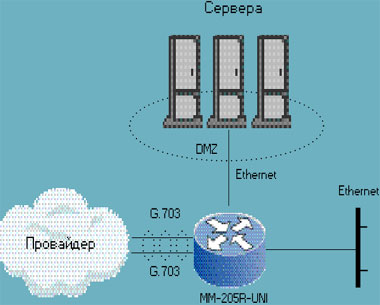 | Рисунок 5. Маршрутизатор «Зелакс» ММ-205R-UNI предназначен для подключения корпоративных сетей к провайдеру и поддерживает обюединение двух каналов G.703 для увеличения пропускной способности. |