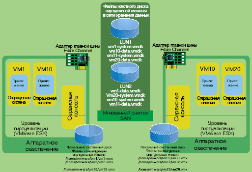 Раздельное хранение систем виртуальных машин и содержимого виртуальных машин в сети хранения облегчает процессы восстановления.