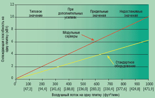 Охлаждающая способность воздуха, подводимого к корпусу стойки через панель в фальшполу, в зависимости от величины воздушного потока, проходящего через одну панель.