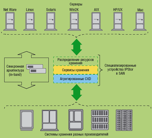 | Многофункциональное ПО виртуализации ресурсов хранения, агрегирования и обеспечения коллективного доступа к сетям хранения IPStor позволяет создать большое число виртуальных дисков, выделяемых приложениям, объединить несколько физических устройств в одно логическое, строить отказоустойчивые кластеры систем хранения, реализовать для разных ОС решения ILM с миграцией данных. |
