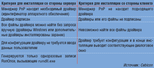 При инсталляции со стороны клиента осуществляется взаимодействие с пользователем, в большинстве случаев — в форме известного «ассистента для поиска нового аппаратного обеспечения». Для инсталляции драйвера зарегистрированному пользователю нужны права администратора, поскольку данная процедура влечет за собой изменения в системе. Далее в зависимости от типа инсталляции следуют выбор и инсталляция подходящего драйвера: со стороны сервера — при взаимодействии менеджеров PnP в режиме пользователя и ядра, со стороны клиента — в режиме пользователя с привлечением новой динамически подключаемой библиотеки (Dynamic-Link Library, DLL) и с применением «ассистента для поиска нового аппаратного обеспечения». После инсталляции драйвера менеджер PnP в режиме ядра снова получает управление, загружает драйвер и запускает устройство (см. Таблицу 1).