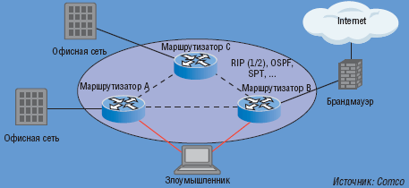 | Рисунок 2. В результате перенаправления маршрутизации агрессор получает доступ ко всем пакетам данных в сети. |