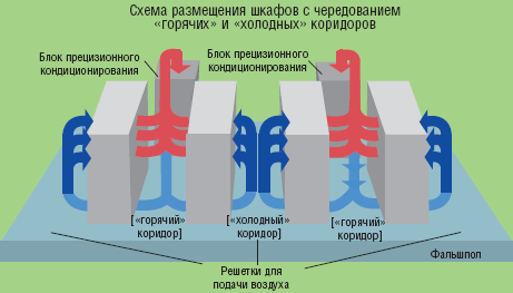 В Emerson Network Power подчеркивают, что оборудование должно устанавливаться с учетом требований по климатике с организацией «горячих» и «холодных» коридоров. Доказав свою работоспособность, подобный подход стал общепринятым (см. Рисунок 6) и зафиксирован в руководящих документах ASHRAE с конца 80-х гг.