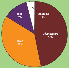 | Рисунок 8. Распределение потребляемой ЦОД мощности по различным системам (по информации HP). |