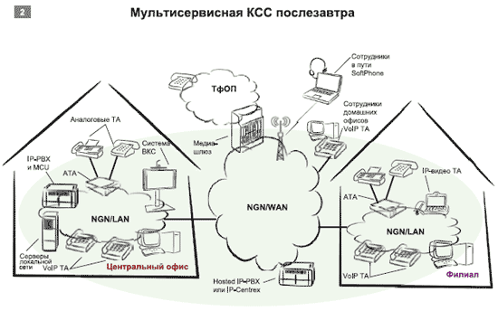 Так или иначе, но использование всех упомянутых выше вариантов требует от компании кардинальной перестройки существующей сети IP. По сути, это шаг в послезавтра, когда основу всех телекоммуникаций будут составлять сети следующего поколения (Next Generation Network, NGN). Все абоненты КСС (центральный офис, филиалы, а также сотрудники в домашних офисах и находящиеся в пути) станут подключаться с помощью VoIP, а передача голосового трафика вместе с видео и данными приложений будет осуществляться по одной мультисервисной сети — NGN (см. Рисунок 2).