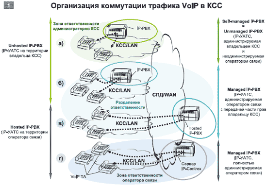 Революционный путь построения корпоративной сети связи на базе VoIP предполагает отказ от традиционной коммутации (т. е. от коммутации каналов) с помощью УАТС и внедрение IP-PBX (IP-УАТС), которые являются новым поколением систем связи, изначально ориентированным на VoIP (см. Рисунок 1а, б). Вместо IP-УАТС в КСС для коммутации трафика VoIP можно воспользоваться услугами операторов связи Hosted IP-PBX (виртуальная IP-УАТС) (см. Рисунок 1в) или IP-Centrex (аренда коммутационной емкости) (см. Рисунок 1г).
