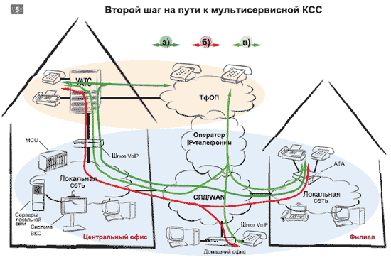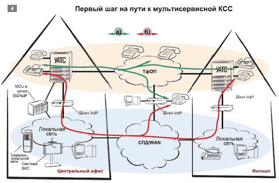 Анализ опыта внедрений технологий VoIP в КСС показывает, что процесс трансформации КСС из ее нынешнего состояния в мультисервисное будущее можно разбить на несколько этапов. Первым шагом может стать использование шлюзов VoIP для перевода части голосового трафика (см. Рисунок 4а) в сеть передачи данных (СПД) (см. Рисунок 4б) с целью объединения всех офисов в единую сеть, подключения абонентов домашних офисов к внутренней телефонной сети и снижения затрат на оплату услуг операторов ТфОП.