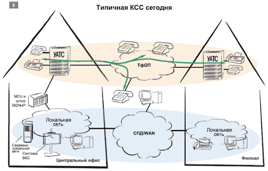 Как можно видеть из рассмотренных рисунков, VoIP КСС состоит из определенного набора устройств. Предполагается, что основным терминальным оборудованием будут являться VoIP-телефоны (обычные или видео), а также аналоговые аппараты, подключенные через шлюзы VoIP или VoIP ATA. Мобильные сотрудники станут использовать телефоны с поддержкой WiFi (при перемещении в пределах офисов) или программные ТА с телефонной гарнитурой (ТГ) — при работе в командировках или дома.