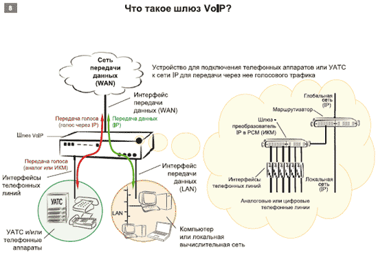 Шлюзы VoIP существенно отличаются по стоимости, функциональности и надежности. Прежде чем рассматривать потенциальные приложения для шлюзов VoIP в КСС, необходимо понять, каково их предназначение и каким набором функций они должны обладать. Основная их задача — подключение телефонных аппаратов или УАТС к сети IP для передачи через нее голосового трафика (см. Рисунок 8).