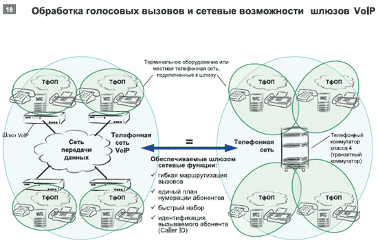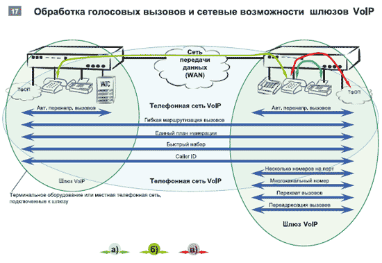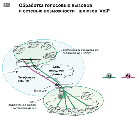 Шлюзы с расширенным набором функций значительно упрощают внедрение технологий VoIP в существующие КСС — обработку вызовов внутри шлюза VoIP (см. Рисунок 17а) или внутри сети шлюзов VoIP (см. Рисунок 17б), а также сопряжение сегмента VoIP с ТфОП (см. Рисунок 17в). Даже такие задачи, как организация многоканального телефонного номера или подключение нескольких телефонных номеров по одному каналу, не вызовут проблем у интегратора.