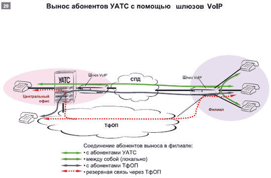 При построении выносов абонентской емкости шлюз VoIP должен обладать частью функциональности малой УАТС, что необходимо для установления внутренних соединений без выхода в сеть IP, организации групп абонентов, перехвата и переадресации вызовов в рамках шлюза, а также автоматического перенаправления вызовов в ТфОП при отказах в сети IP.