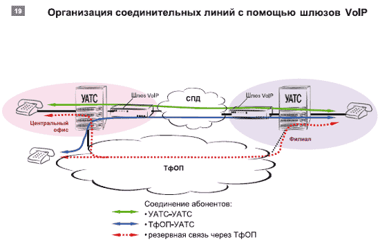 Благодаря шлюзам VoIP сегодня можно создавать наложенную корпоративную телефонную сеть с возможностью доступа к любому сотруднику без выхода в ТфОП. Для этого абоненты филиалов подключаются к УАТС центрального офиса (которая, как правило, уже имеется) с помощью абонентских выносов, построенных на основе шлюзов VoIP (см. Рисунок 19).