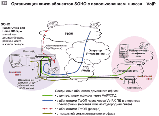 Уникальным применением шлюзов VoIP является подключение к корпоративной сети сотрудников, работающих дома (см. Рисунок 23). Достаточно подсоединить квартиру к СПД/Internet и установить в ней шлюз, чтобы человек стал доступен в КСС так же, как если бы работал в офисе (внутренний телефон, персональный компьютер и все необходимые приложения). Учитывая, что стоимость аренды офисов растет, а перемещения по городу отнимают очень много времени и сил, такое приложение становится все более и более востребованным.