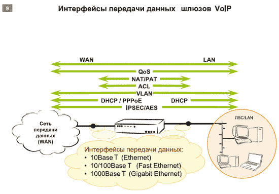 В большинстве случаев приходится решать и вопросы сопряжения с сетями передачи данных (СПД общего пользования или глобальной и локальной сетью), поэтому весьма удобным оказывается наличие у шлюза VoIP встроенного маршрутизатора. От этой части шлюза требуются надежность и многофункциональность: маршрутизатор должен поддерживать широкий набор протоколов маршрутизации, авторизацию пользователей с возможностью автоматического получения и выдачи IP-адресов (как сервер и как клиент), задание приоритетов для различных видов трафика (QoS), а также достаточный набор функций управления пропускной способностью, сетевой безопасности, учета/анализа трафика и администрирования (см. Рисунок 9).