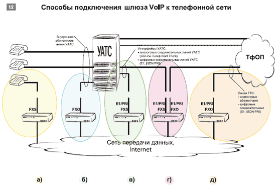 В зависимости от задач, которые решает шлюз VoIP, он может быть подсоединен к телефонной сети одним из пяти способов. Прежде всего (см. Рисунок 12а) — в качестве аналогового адаптера или при организации абонентских выносов — с его помощью к сети VoIP подключаются аналоговые телефонные аппараты. Способ сопряжения шлюзов VoIP с УАТС определяется целым набором факторов: решаемой задачей (например, вынос абонентской емкости, присоединение к оператору IP-телефонии, организация соединительных линий через IP), наличием свободных интерфейсов на УАТС, ее возможностями по маршрутизации телефонного трафика и доступом к ним организации, которая устанавливает и обслуживает шлюз VoIP. Так, шлюз VoIP может входить в состав абонентских комплектов УАТС (см. Рисунок 12б), подключаться к выделенным интерфейсам соединительных линий (СЛ) УАТС (см. Рисунок 12в) или устанавливаться в разрыв соединительных линий УАТС, связанных с ТфОП (см. Рисунок 12г).