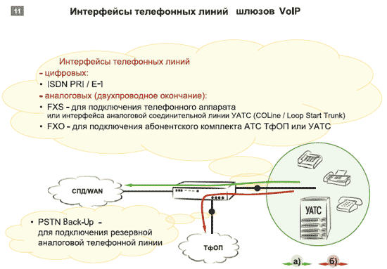 Не менее важная часть шлюзов VoIP — их интерфейсы со стороны телефонной сети и набор функций по обработке (маршрутизации) телефонных вызовов. Для сопряжения с устройствами телефонной сети шлюзам достаточно поддерживать три вида интерфейсов (см. Рисунок 11а): аналоговые FXS и FXO, а также цифровой E-1 (с поддержкой различных сигнализаций). При подключении шлюзов VoIP к аналоговой телефонной сети иногда требуется наличие порта, который аналогичен FXO, но может использоваться только для подключения резервной аналоговой телефонной линии (абонентского комплекта АТС ТфОП), куда направляется голосовой трафик (см. Рисунок 11б) в случае отказа сети IP (так называемый PSTN Back-Up).