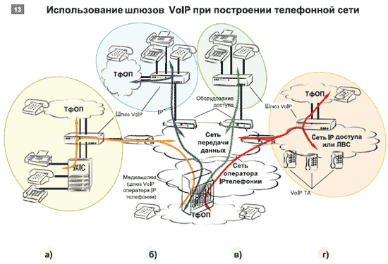 Благодаря перечисленному выше набору интерфейсов и разнообразию способов подключений, шлюзы VoIP используются для решения широкого круга задач, возникающих на стыке VoIP и традиционных технологий при построении телефонной сети. В существующей телефонной сети они могут применяться для перевода в сеть передачи данных на базе IP части голосового трафика абонентов, когда они подключаются к ТфОП через УАТС (см. Рисунок 13а) или непосредственно (см. Рисунок 13б).