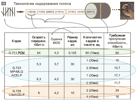 Немаловажным аспектом является набор и особенность реализации используемых в VoIP технологий кодирования голоса (т. е. кодеков). Несмотря на то что кодеки стандартизованы (см. Рисунок 15), качество звука, полученное в результате прохождения всей цепочки, у разных производителей может отличаться. И тут не обойтись без предварительного изучения продукта.