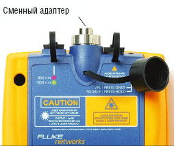 | Рисунок 2. Измерительный прибор со сменным приборным адаптером. Здесь представлена модель DTX-MFM2 компании Fluke Networks. |