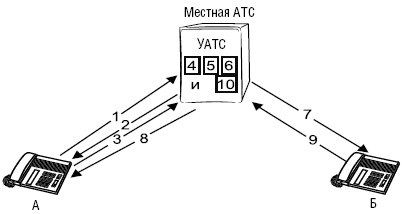 Установление соединения между абонентами А и Б при организации традиционного соединения ТФОП. Для большей наглядности предположим, что абонентов А и Б обслуживает одна и та же местная АТС, и поэтому они не нуждаются в услугах системы сигнализации SS7.