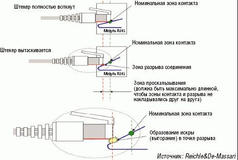 При подключении или отсоединении под напряжением могут возникать электрические дуги, в результате чего возникает риск повреждения контактных поверхностей (см. Рисунок 1). При наличии разъемных соединений Категорий 6А, 7 и 7А схема контактов существенно отличается от традиционной, поэтому в большей или меньшей степени подвергается воздействию электрических разрядов. По сведениям R&M, в процессе работы над стандартизацией PoE+ эта тема еще не затрагивалась. В результате собственных исследований производитель выяснил, что продолжительность сохранения качества штекерного контакта определяется свойствами используемых материалов, качеством покрытия, формой, а также силой прижатия контактов. Эти выводы планируется включить в технический отчет комиссии по стандартизации IEC SC48B.