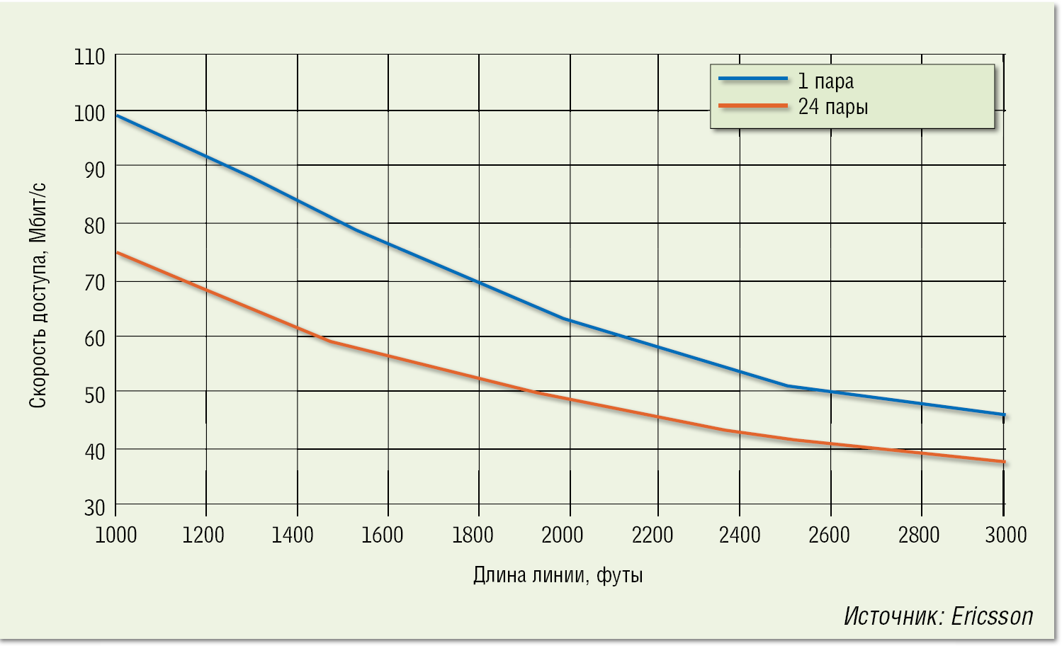 Возможность подключения до 90–98% абонентов. По результатам испытаний на реальных сетях в 25-парном кабеле Категории 3 можно задействовать почти все пары, пусть и ценой заметного снижения скорости вследствие переходных помех (см. Рисунок 2).