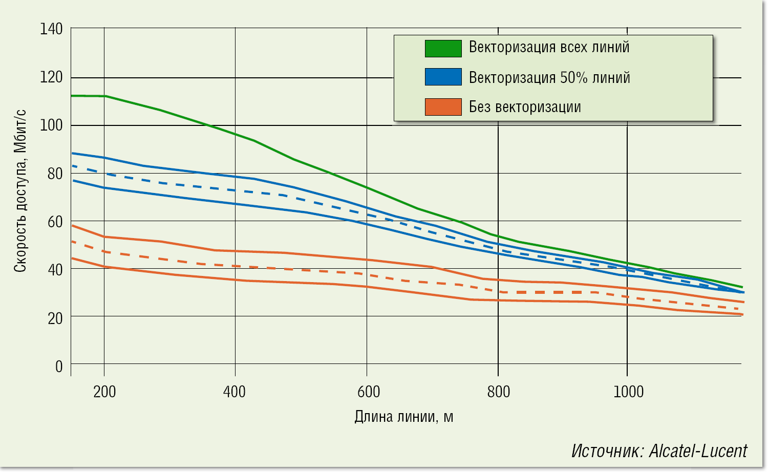 | Рисунок 3. Векторизация линий VDSL позволяет практически полностью компенсировать влияние соседних пар в многопарном кабеле на скорость и дальность связи. |