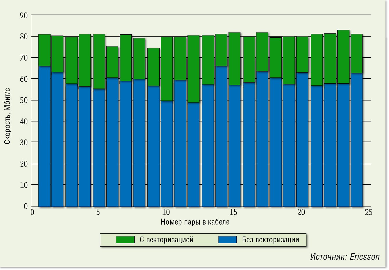 | Рисунок 4. Использование векторизации позволяет не только увеличить скорость доступа, но и выравнять скорости абонентского доступа (25-парный кабель, 500 м, диаметр провода 0,4 мм). |