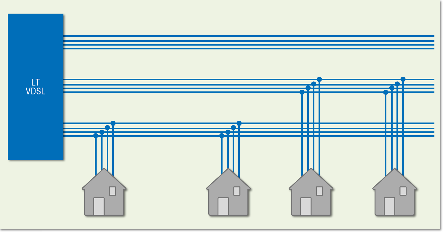 Еще одно наглядное, пусть и теоретическое, доказательство возможностей VDSL2 и меди — технология Cuprum PON (CuPON), предложенная в 2007 году как альтернатива оптическим сетям доступа. CuPON адаптировала идею пассивных оптических сетей к медным линиям и позволяет без прокладки дополнительных медных магистралей предложить абонентам скорости до 250–500 Мбит/с при дальности 300–500 м. Для этого в магистральном кабеле предлагалось организовать четырехпарные шины, к каждой из которых можно подключить до четырех абонентов (см. Рисунок 5). Общее число пользователей, подключаемых к кабелю, остается без изменений. Каждая шина — с помощью все той же векторизации, фантомизации и бондинга — поддерживает пропускную способность до 1 Гбит/с, которая делится между абонентами в необходимой пропорции. Хочешь по 250 Мбит/с сразу всем, хочешь — 1 Гбит/с, но по очереди.