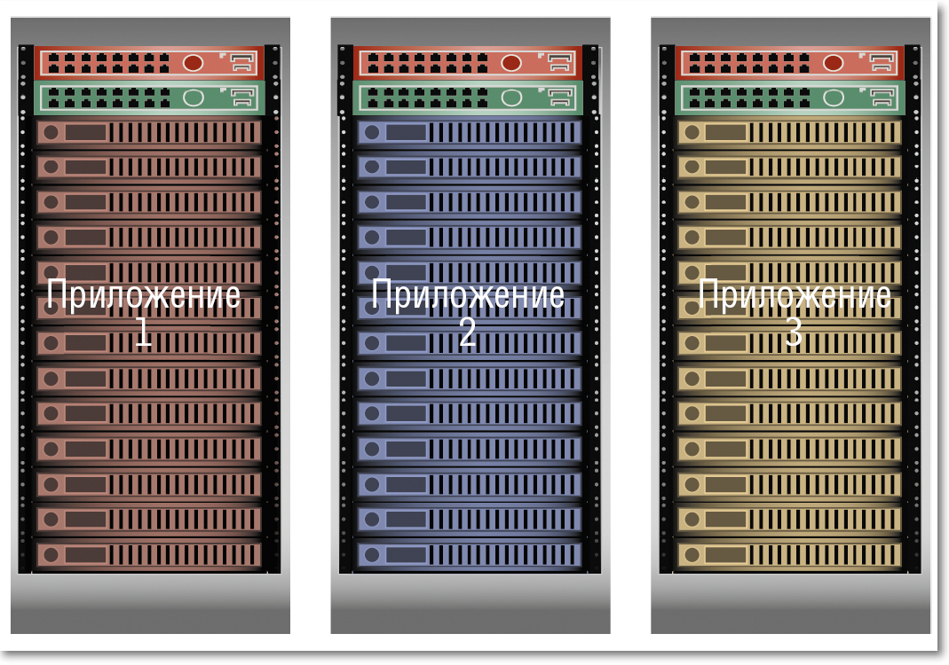 Традиционные центры обработки данных часто состоят из так называемых бункеров (silo), когда физическим стойкам с серверами и другими аппаратными компонентами назначается какая-то определенная задача (приложение). Значительная часть производимого трафика (операции, коммуникация между процессами) остается внутри стойки, за ее пределы выходит лишь незначительный объем данных (см. Рисунок 2).