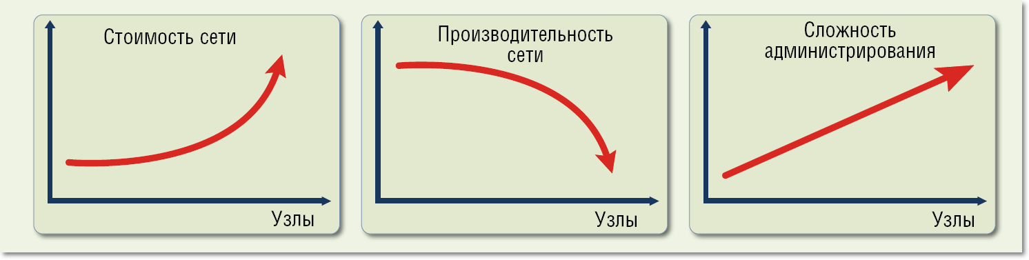 Доступные до сих пор решения для коммутации сетей и соответствующее программное обеспечение практически не поддаются масштабированию, ведь они не разрабатывались для этих целей. Растущие сети приводят к экспоненциально возрастающим расходам, снижению эффективности и увеличению трудностей при администрировании. На Рисунке 4 показан эффект, характерный для разрастающихся сетей: затраты увеличиваются, производительность снижается, а администрирование усложняется. Как уже было сказано, в традиционных сетях чаще всего устанавливаются три вида коммутаторов: дешевые модульные (Blade), устройства типа ToR или значительно более дорогие агрегирующие. Растущим сетям необходим дополнительный уровень агрегации, чтобы соединить небольшие сегменты сети, поэтому на каждый серверный порт приходится несколько портов для подсоединения коммутаторов. Соотношение между количеством серверных и сетевых портов ухудшается, так что требуется все больше и больше дорогостоящих портов для агрегирования.
