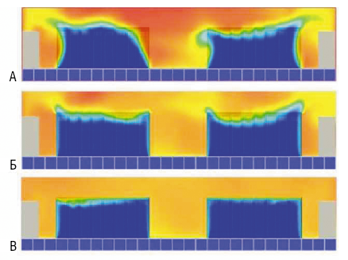 | Закрывайте коридор. Тепловая картина в зале ЦОД: А — холодный коридор не изолирован, Б — установлены торцевые двери, В — установлены двери и крыша. |