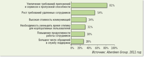 Согласно недавнему исследованию Aberdeen, 64% компаний приобретают «ускорители» и оптимизаторы WAN с целью развертывания приложений VoIP. В среднем по отрасли затраты на оптимизаторы WAN составляют во внедривших их компаниях около 100 долларов на пользователя, а в наиболее эффективных инсталляциях — менее 40 долларов. В числе основных факторов, побуждающих заказчиков инвестировать в подобные решения, — рост требований приложений и сервисов к пропускной способности глобальной сети, необходимость организации удаленной работы и высокая стоимость передачи данных (см. Рисунок 2).