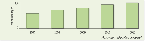 По мнению аналитиков Gartner («Магический квадрант» за декабрь 2010 года), лидерами мирового рынка контроллеров оптимизации WAN являются Riverbеd Technology, Cisco Systems и Blue Coat System. Компании Juniper Networks, F5 Networks и Circadence отнесены к нишевым игрокам, а Silver Peak Systems, Citrix Systems и Ipanema Technologies причислены к «провидцам». По прогнозам Infonetics Research, в этом году оборот мирового рынка оптимизаторов WAN может достичь 1,4 млрд долларов (см. Рисунок 3), а в последние годы лидерами по объему продаж в данном сегменте были Blue Coat, Cisco и Riverbed. На российском рынке, пожалуй, наиболее известны продукты Riverbed SteelHead, Cisco WAAS, Juniper WXC и BlueCoat ProxySG.