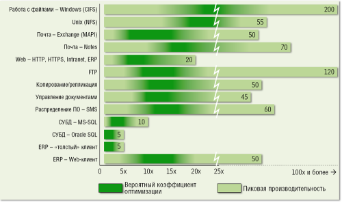 Как утверждают производители, аппаратно-программные решения Riverbed позволяют достичь такой же скорости работы бизнес-приложений в WAN, как и в локальных сетях. Устройства Steelhead компании Riverbed оптимизируют трафик на разных уровнях — от TCP до конкретных приложений. Число пакетов TCP при передаче данных сокращается на 65–98%. Параметры соединения автоматически оптимизируются в зависимости от происходящих событий, например потери пакетов. По данным Riverbed, ее устройства Steelhead обычно ускоряют работу приложений (Microsoft Exchange, Oracle11i, SAP) в среде WAN в 5–50 раз, а в некоторых случаях (CIFS, FTP) и до 100 раз, причем требования к пропускной способности сокращаются на 60–95% (см. Рисунок 6). Наилучшие результаты достигаются при оптимизации пропускной способности для CIFS, MAPI, HTTP, NFS, SQL.