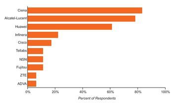 Компания Ciena входит в тройку мировых лидеров в области оптического транспорта. Так, согласно отчету Dell’Oro Group, во II квартале 2011 года с 15% она занимала второе место на рынке систем DWDM после Huawei (18%), немного опережая третьего игрока — Alcatel-Lucent (14%). С нескрываемым удовольствием представители Ciena приводят результаты масштабного исследования, проведенного недавно компанией Infonetics, которое показало, что операторы связи считают Ciena лидером в области оптического транспорта и коммутации (см. рисунок). В ходе этого исследования были опрошены представители 18 крупных операторов связи, на долю которых приходится 20% всех доходов на телекоммуникационном рынке.