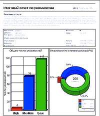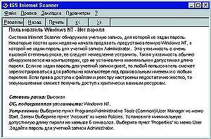 Механизм генерации отчетов Internet Scanner позволяет выбирать из 30 готовых форм. Они позволяют получить как обобщенные данные об уровне защищенности всей организации (рис. 1), так и подробные отчеты, содержащие техническую информацию о том, где и какие «слабые места» обнаружены, а также инструкции по их устранению (например, пошаговые рекомендации по изменению системного реестра Windows или строки в конфигурационных файлах Unix, гиперссылка на FTP- или Web-сервер с обновлением, устраняющим уязвимость). Отчеты могут быть выведены не только на английском, но и на немецком, французском, испанском, португальском и, что примечательно, на русском языке. Русифицирована и подсистема описания уязвимостей (рис. 2.).