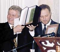 Любое сообщение о SatExpo`99, которое прозвучит в России, будет неполным без упоминания о знаменательном для нашей страны событии. Впервые российский телеканал удостоился главной международной награды в области спутникового телевещания, вручаемой на SatExpo, — «европейского «Оскара» (Hot Bird Award). Лауреатом в номинации «Художественные фильмы» стал канал спутникового телевидения НТВ «Наше кино». Награду получили Евгений Якович, генеральный директор спутниковой телевещательной компании «НТВ-плюс», и директор главной редакции телеканалов той же компании Сергей Левин (слева)