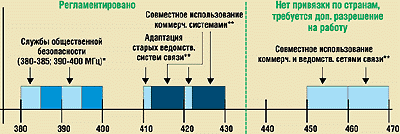 Касаясь распределения диапазонов частот, принятого в Европе для TETRA по рекомендации SEPT (см. рисунок), г-н Грей подчеркнул, что в настоящее время ассоциация TETRA MoU объявила о намерении провести семинар для операторов сетей D-NMT, на котором будут раскрыты возможности работы TETRA «в режиме» сотовой связи в диапазоне 450 МГц. По мнению специалистов, эти возможности позволят найти «точки соприкосновения» TETRA и нового стандарта D-NMT, использующего полосу 25 кГц и обеспечивающего работу по общему каналу цифровых и аналоговых станций. Как член рабочей группы ETSI, г-н Грей сообщил также, что в ближайшем будущем начнутся испытания совместного использования «закрытыми» системами и сетями коммерческого назначения TETRA диапазона 460—470 МГц (поддержку диапазона 800 МГц пока не обеспечивает ни один из производителей оборудования).