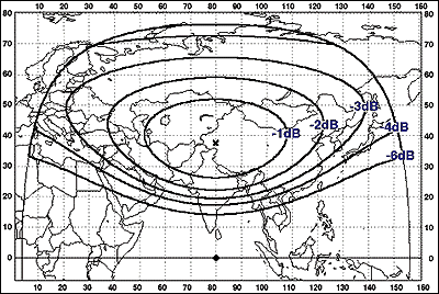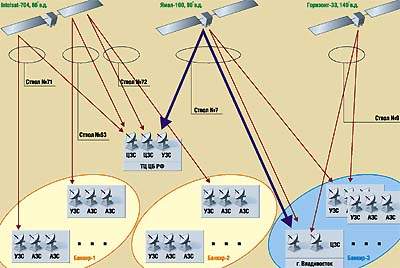 Для организации связи используются геостационарные КА (в основном — «Экспресс-6», ствол 7, расположенный в точке 80о в. д.). Станции VSAT могут быть установлены практически в любом месте на территории России и стран СНГ (см. рис. 2), так как их энергетика (4 дБ) рассчитана на размещение внутри зоны.