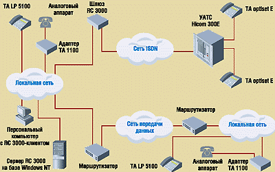 Данная система ориентирована на работу в IP-сетях и состоит из трех основных компонентов: HiNet RC 3000 сервер, HiNet RC 3000 ПК-клиент и шлюз H.323/ISDN. На рис. 2 показан вариант построения корпоративной телекоммуникационной системы с использованием HiNet RC 3000.